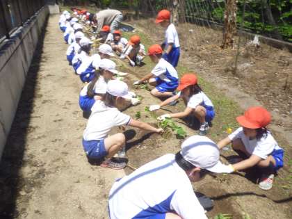 地域の安馬さんが植え方を教えてくださいました。子どもたちは,教えてもらったことをしっかり守って植えていました。