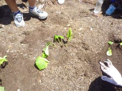 植えた後,みんなで「大きい 大きい いもに なれ。」「あまい あまい いもになれ。」とおまじないをかけました。