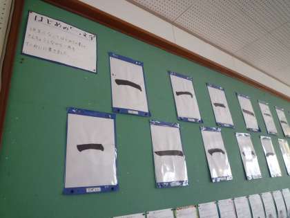 3年生は先週,初めての毛筆に挑戦しました。筆の持ち方や力の入れ方に気をつけながら,一画をていねいに書きました。少し緊張しながらも,集中して書いた「一」の字には,それぞれの子の個性が表れています。学習のあとに,自分から進んで墨の汚れを拭き取る姿も素敵でした。