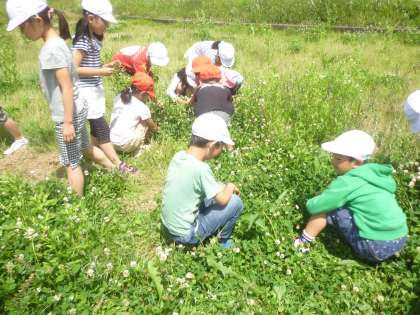 田んぼでは,たくさんのおたまじゃくしを発見し,空き地では,タンポポやシロツメ草,クローバー,カエル,バッタなどを見つけ,とてもいい顔をしていた子どもたちでした。2年生では,自然にたくさん触れる活動をしています。