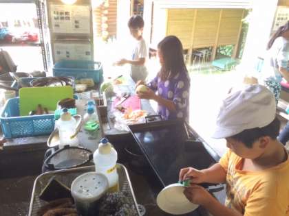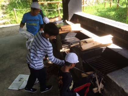 今日は2回目の野外炊事です。今回は自分が食べるだけでなく、ほかのグループにも食べてもらうことを意図して作ります。グループで協力しながら、手際よく進めています。
