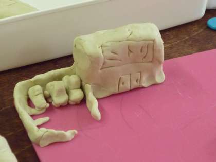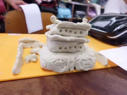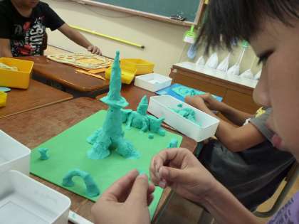 今日の図工は粘土でした。お弁当や○○屋さんなど,テーマを決めて楽しみながら粘土を柔らかくしたあと,自分だけの町を作りました。細かいところまでこだわった作品がたくさん生まれました。