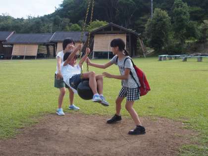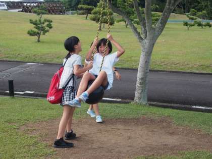 朝食後、施設内にあるブランコで楽しそうに遊んでいます。