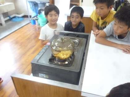 透明の鍋の中で,ポップコーンのできる様子を,耳と目と鼻をしっかりはたらかせ,観察しました。