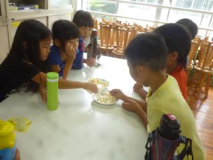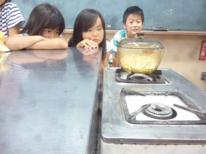 子どもたちは,ポップコーンがはじけるたびに目を輝かせ,驚きながら,うれしそうに見ていました。出来上がったポップコーンは,あっという間に子どもたちの口の中へ。おいしいおいしいと言って食べていました。