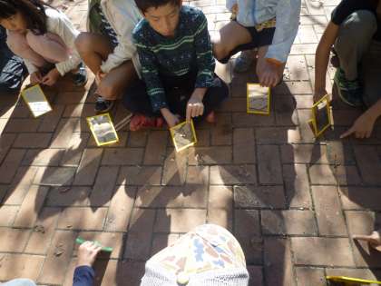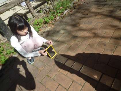理科の学習で,太陽の光の進みかたを考えました。鏡で反射させた光を見ると……「わぁ!まっすぐや!」。まるで道ができるように,光が真っ直ぐ進むことがわかりました。友だちと協力して,「光のリレー」にも挑戦しました。