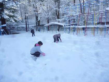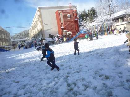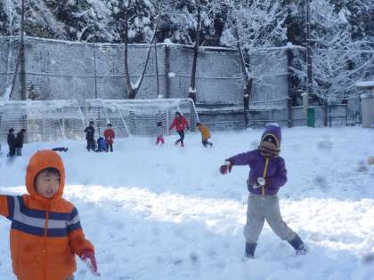 今年も雪が降りました。今日は,時間割変更です。積もった雪で,雪遊びを楽しみました。