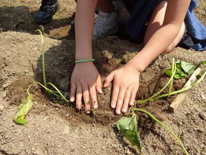 苗の半分が土の中に入るように,上手に土のお布団をかぶせました。