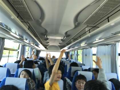 バスレクリエーションでは、花背山の家のキャンプファイアーで歌った歌の大合唱や伝言ゲーム、クイズなどで盛り上がっています。