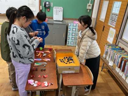 クリスマス会を楽しんだ後は、余った折り紙の景品や使った物をみんなで分けていました。