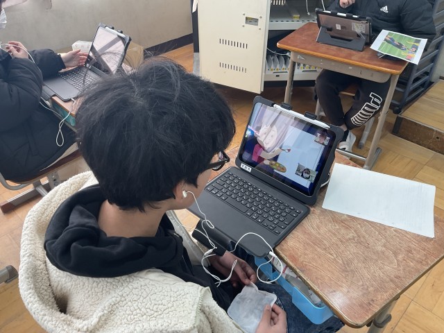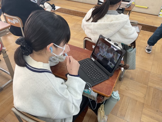 中学校生活に向けて考えていることを英語で他校の友達と交流しました。