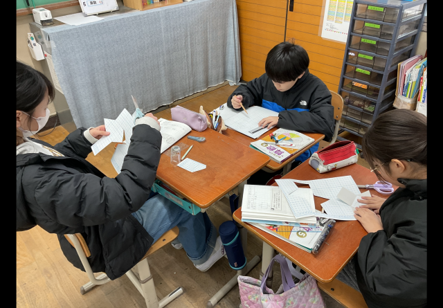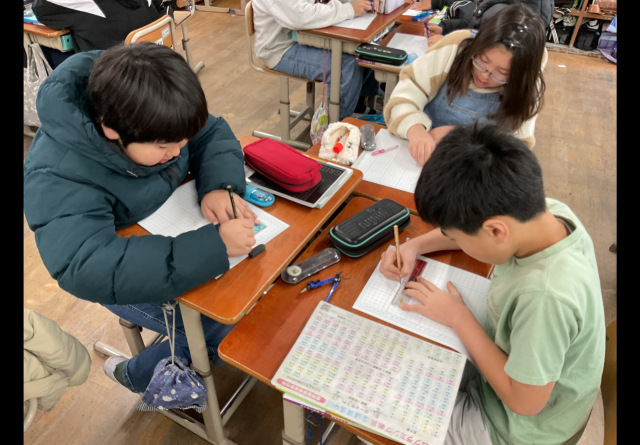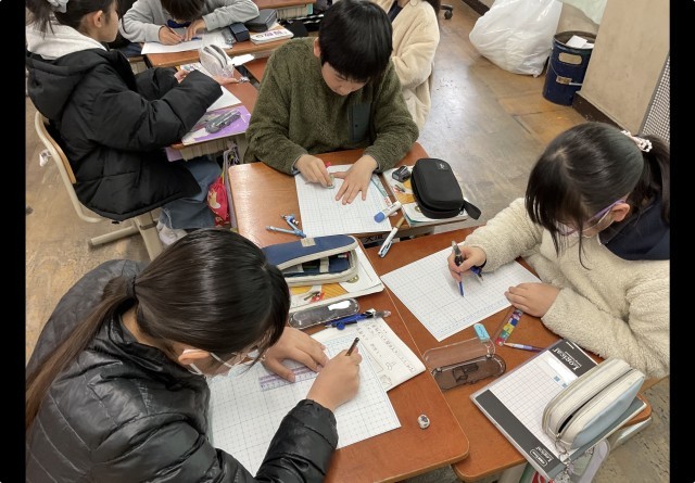 三角柱の展開図のかき方をグループで話し合いながら、作ることができました。