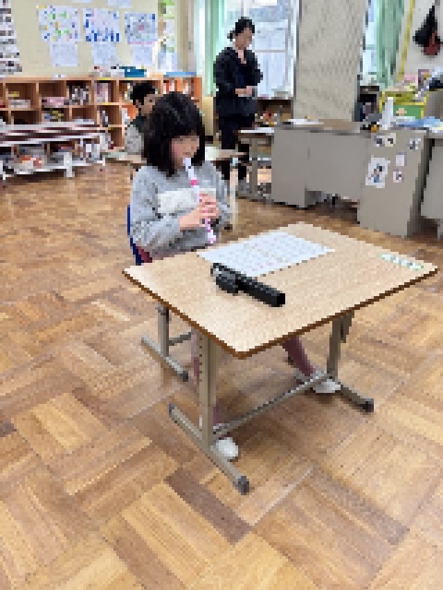 リコーダーで ミッキーマウスマーチを ふいています。もう じゅんびは オッケー。あしたは たのしみです。