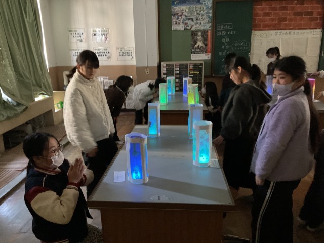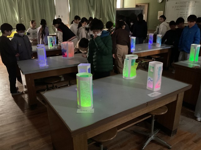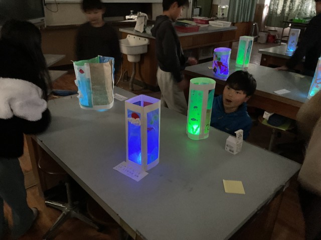 最後の図工は、理科室がたまたま空いていたので、カーテンを閉めて暗くして鑑賞会をしました。