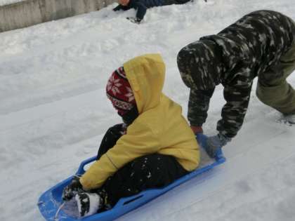休み時間などに,そり遊びや雪の造形を楽しんでいます。