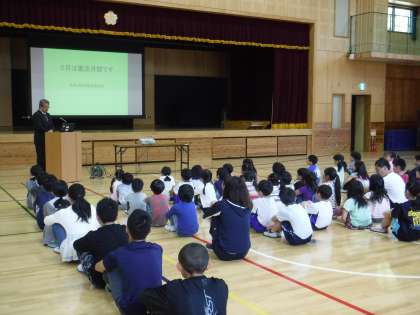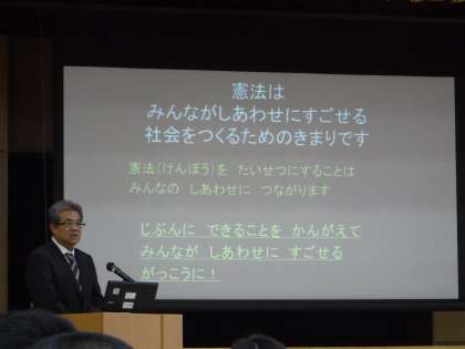 朝会で校長先生から憲法についてのお話をお聞いた後,