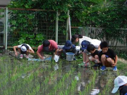 サポーターの先生の田んぼで,「ホウネンエビ」や「オタマジャクシ」を