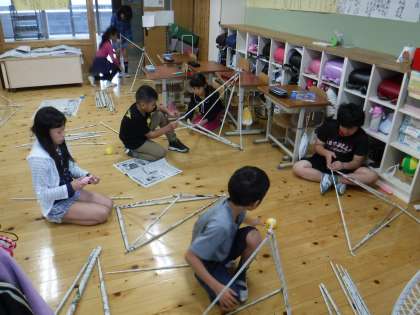 今日は,新聞を細長く巻いてつくった棒状のものを使いました。