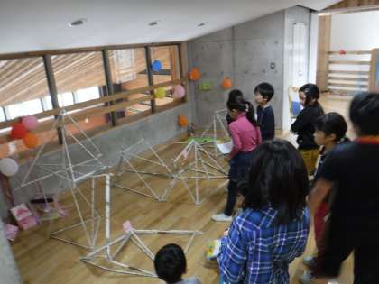 図工の学習で,割りばしや枝などの細長い物をつないで