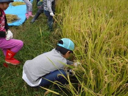 今日は,全校児童が力を合わせて稲刈りをする日です。