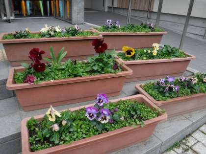 プランターでは,パンジーが色とりどりの花を咲かせています。