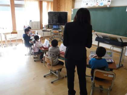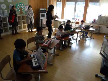 1年生は,音楽「たがいのこえをきいてうたおう」の学習です。