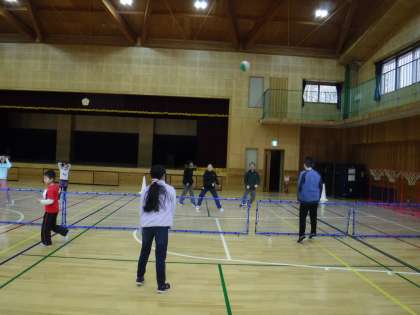 連休明けの朝の運動は,体育館でソフトバレーボール。