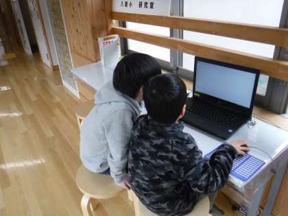 放課後に八瀬ラボでコンピュータを操作する2名の子どもたち。