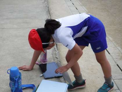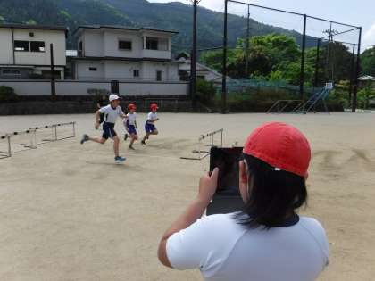 そこで,グループで協力して,友だちの走る姿をタブレット型PCで動画撮影します。