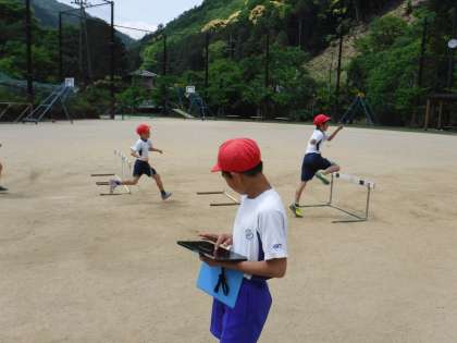 体育の時間にハードル走に取り組んでいる5,6年生。