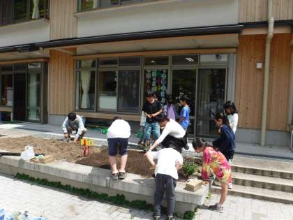 学級園では,3年生が理科の学習で種まきをしていました。