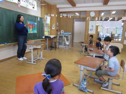 栄養教諭の岡田先生に「つぶやきひめ」という紙芝居を読んでもらいました。野菜も牛乳も嫌いで元気がなくなったお姫さまが、毎日牛乳を飲み野菜もたくさん食べている元気いっぱいの女の子の話を聞いて,好き嫌いなく食べることの大切さに気づくお話でした。2年生の子ども達も好き嫌いなく食べてほしいと思います。