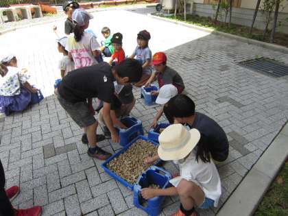 その後に,2年生が1年生に「石はこれくらい入れるんだよ。」「土もうちょっと入れた方がいいよ。」とアドバイスしながら,一人一人植木鉢に種をまきました。