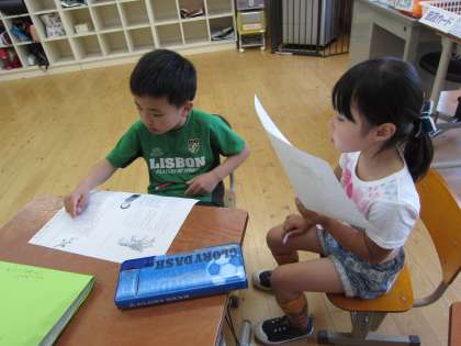 国語で「かんさつ名人になろう」の学習をしています。かんさつ文から名人わざを見つけて,友だちと話し合いました。