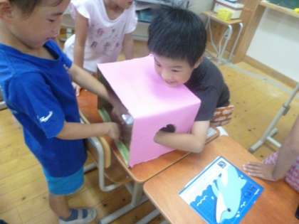今日は,いろいろなかたちを仲間分けする活動をしました。子どもたちは,かたちの特徴をとらえて,3つの仲間に分けました。後半は,箱の中に入っているものが,どのかたちの仲間か当てるゲームをしました。子どもたちは,前半に学習したことを生かして,どの仲間か一生懸命考えていました。