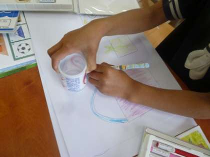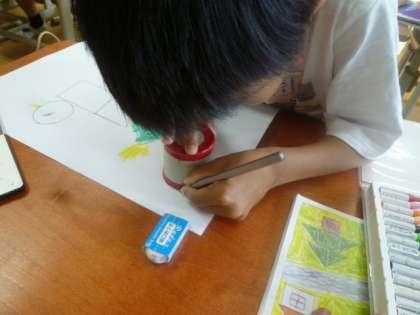 今日は,いろいろな形を紙に写し取って,絵を描きました。三角と丸の形をつなげてアイスクリーム,丸の形を2つつなげて雪だるまなど,写し取った形から想像を広げて,絵を描いていました。