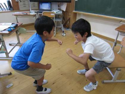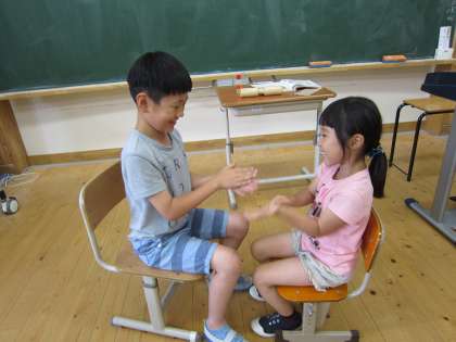 音楽で3拍子に合う手遊びをしながら,楽しく「たぬきのたいこ」を歌いました。2人組で考えて,楽しく工夫して手遊びをしていました。運動会の時の応援をまねて,「ピピオー!ピピオー!」と考えた子もいました。