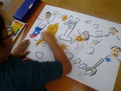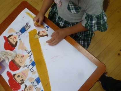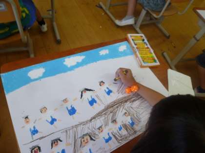 今日は,先週行われた運動会の思い出を絵に表しました。「つなひき面白かったな!」「リレーはいい勝負だったね!」」と,運動会の思い出を話しながら,楽しそうに絵を描いていました。