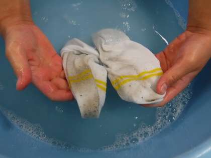 かかとやつま先など,汚れの激しい部分をつまみ洗いやもみ洗いすることで,
