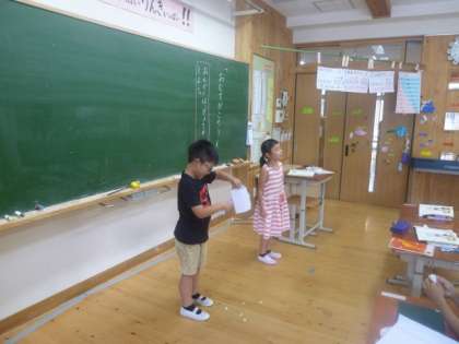 「おむすびころりん」の音読発表会をしました。本番に向けて,グループごとに練習を重ねたり,小道具をつくったりして準備をしてきました。今日の発表会では,おむすびが落ちる穴や,振ると小判が落ちてくる小づちなどを使ったり,実際にねずみの踊りをしたりして,場面の様子がよくわかるように音読をしていました。音読の仕方も,とても上達してきました。