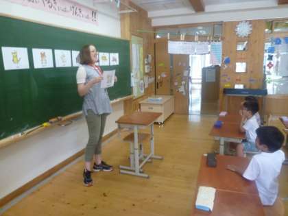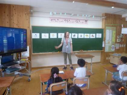 チャレンジ学習の時間に,ALTのジェッサ先生に来ていただいて,いろいろな動物の名前を英語で言う学習をしました。先生が出した走物の絵を見て,「dog!」「cat!」「lion!」など,元気よく英語で答えていました。