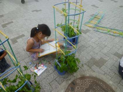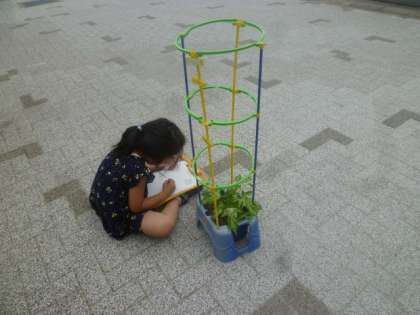 アサガオの観察をしました。つるもだいぶ伸びてきて,「自分の身長くらいの高さになったよ!」と,喜んでいました。