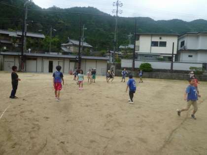 夏休み前最後のみんな遊びは「王様しっぽとり」でした。相手チームの王様のしっぽを先に取ったチームの勝ちです。しっぽを取られないようにしながらも,必死に相手のしっぽをおいかけていました。夏休みも暑さや体調に気をつけながら,たくさん体を動かしましょう。