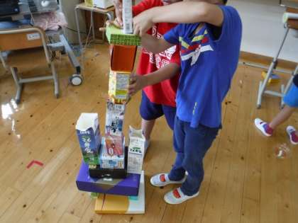 今日は,いろいろな形のはこを,つんだり,並べたり,つなげたりして楽しみました。はじめは,はことにらめっこしながら「どんなことができそうかな。」と悩んでいた子もいましたが,友達と協力しながら,どれだけ高く積めるか挑戦してみたり,はこを並べてお店屋さんをつくったりするなどして楽しんでいました。
