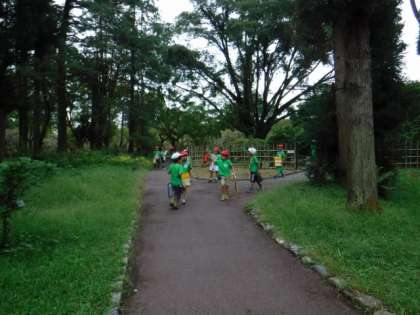 次は,グループに分かれて「ネイチャービンゴ」をしました。「ハートの形をした葉っぱ」や「ひがんばな」などを見つけたり,「水琴窟の音」や「虫の声」などを聞いたりしました。グループで仲良く活動できていました。
