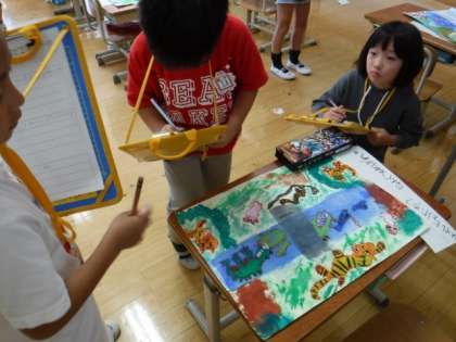 今日は,完成した作品をみんなで鑑賞しました。友達の作品を見て,工夫して描いたところや,頑張って描いたところをたくさん見つけていました。
