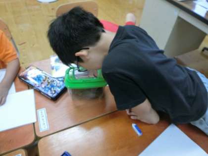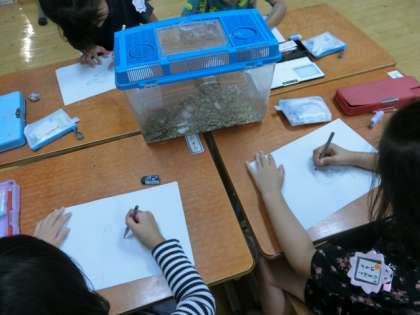 お家の人に紹介する生き物の絵を描きました。目の位置や体の模様など,体の特徴をしっかりととらえながら描いていました。