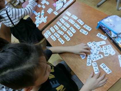 今日は,計算カードを使って,同じ答えになるカードを順番に並べて,並び方のきまりを調べました。カードを並べる活動を通して,規則性に気付いていました。