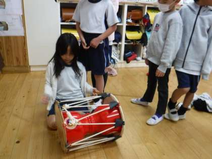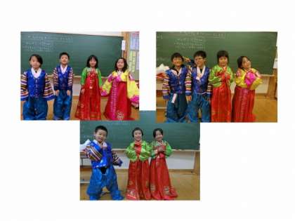 友だちの日では,韓国や朝鮮について学習しました。実際に,韓国や朝鮮の民族衣装の「チョゴリ」を着てみたり,民族楽器の「チャンゴ」をたたいてみたりしました。