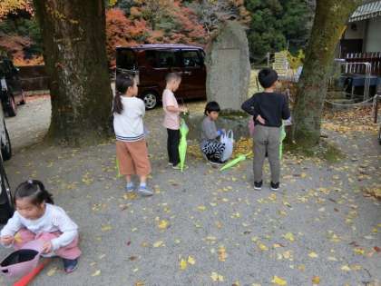 今日は,校区を探検して,様々な「あき」を見つけに行きました。子どもたちは,“どんぐり”や“いちょうの葉”などを見つけて拾っていました。次の時間は,集めたものをつかって「あきのおもちゃ」を作ります。